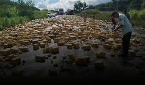Carreta tomba na BR-262 e carga de cerveja fica espalhada pela pista em Mato Grosso do Sul.